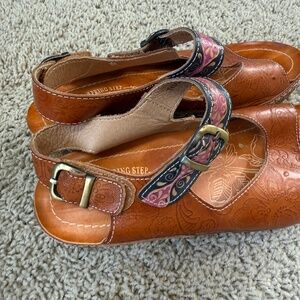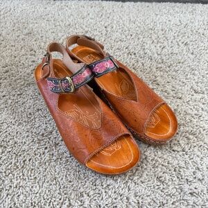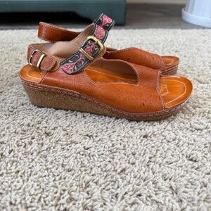 L'Artiste By Spring Step Teddy Women's Genuine Leather Comfort Wedge Sandals Size 39. These sandals features hand-painted leather upper featuring a floral and linear embossed pattern, two adjustable hook and loop straps, and ¾" platform, 2" rubber sole. Color is Camel Multi (Navy/Purple/Cream).