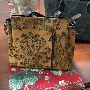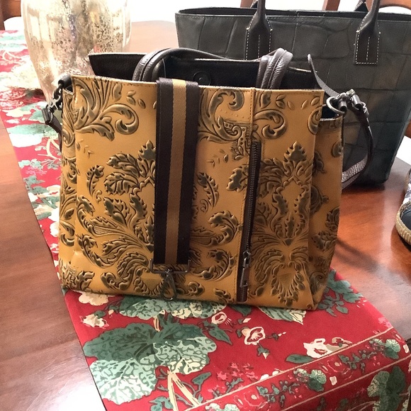 I bought this bag new from Spring Step, but have never carried it. I paid a discounted price of $249.95 (Regular Price: $279.95). I believe this is the mustard color with a carved leather fleur-d-lei design in earth toned burnished accents. Central full length zipper compartment with 2 open wall pouches, opposite zip pocket and attached rolled leather handles. Two large open snap compartments for easy, safe access, horizontal outside zip pocket. Removable, adjustable shoulder strap and storage dust bag. Imported. Measurements are as follows: