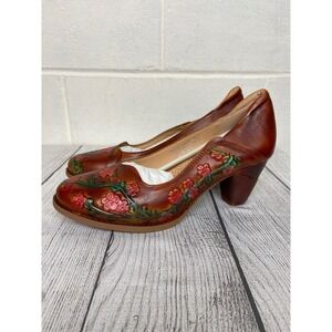 Keywords: L'Artiste, pumps, heels, floral, embossed leather, camel multi, size 9.5, size 10, bohemian, artisan, hand painted, leather heels, women's shoes, dress shoes