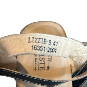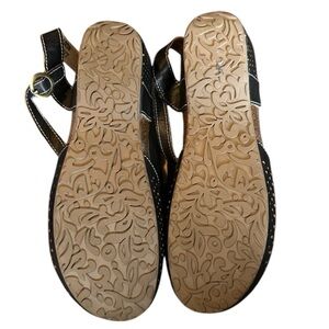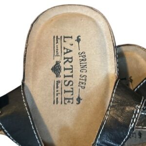 This is a pair of L'Artiste Mary Jane Spring Step flats in black in like new condition, size 41 (US 9). The sandals feature a buckle closure and are made of leather. They are designed for casual occasions and have a vintage style.
