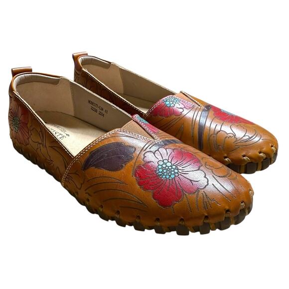 The L'Artiste Modesty Slip-On by Spring Step is a stylish and versatile women's shoe in a camel brown color with a floral pattern. Featuring a slip-on closure and round toe shape, these flats offer comfort and cushioning with a leather lining and insole. Ideal for travel, casual outings, or business meetings, these shoes have a bohemian theme that is perfect for the summer, fall, and spring seasons. Made with a durable rubber outsole, the L'Artiste slip-ons are a fashionable choice for women who appreciate both style and practicality in their footwear.