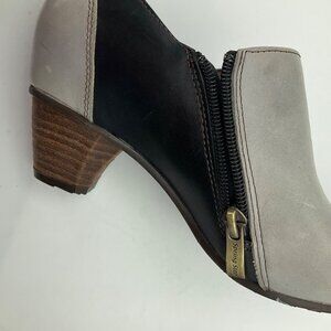 Elegant two-tone leather booties with intricate button accents and a side zipper. Heeled design adds a stylish lift for versatile wear. Very good condition just light scratch back see photo number 7, Material Leather