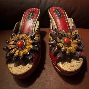 Beautifully crafted L’Artiste by Spring Step “Bloom” wedge sandals. Backless mule clogs, cork wedge and leather upper. Leather sunflowers adorn the top of the sandal and palm leaves are etched into the cork.