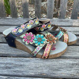 L'Artiste Spring Step Delight Sandals, Brand New! Never worn! Size 9 = 40, Gorgeous French-Inspired slide sandals! Hand painted leather uppers, stunning 3D flowers and a sturdy rubber outsole make for the perfect versatile sandal for all occasions! Padded insole provides comfort, a 2 1/4" cork heel absorbs shock and protects feet! Platform height is 3/4". Navy multi color combo is really fun! Adjustable hook and loop Velcro fastening on the top strap, Brass grommets along the bottom add a tough yet chic element. Each pair of sandals are a one-of-a-kind due to the unique finishing process and natural effect with color variations - so Beautiful! Will be shipped in the original box. Comes from a smoke free home! Fast Shipping!