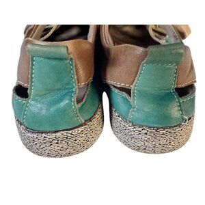 L'Artiste Spring Step "Porscha" cut out lace up sneakers. Sneakers are done in a teal green and brown. They're a woman's EUR size 37 which translates to a US size 6.5.