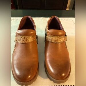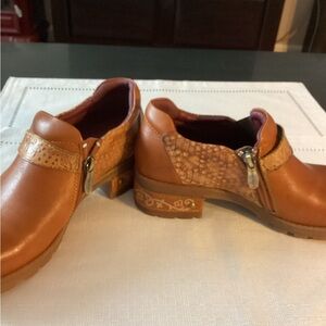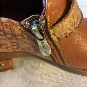 The closed burnished shoe with a zipper and hook and loop adjusts for easy on and off.
