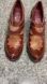 Beautiful pair of shoes in a rich reddish brown with leather tooling. These shoes are slip on with a decorative strap that hides adjustable Velcro.