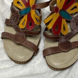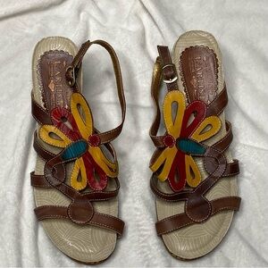 L'Artiste by Spring Step Ronella multi strap leather wedge sandals. Brick red, mustard yellow and turquoise butterfly design on straps over foot. Brown leather upper and cork wedge. These shoes are just gorgeous! New without tags.