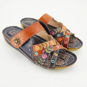 French inspired, hand-painted leather slide sandal featuring unique color blocking and colorful floral embossing design.