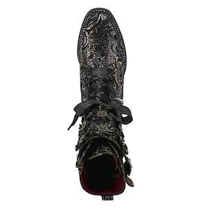 Pop Art metallic suede printed swirls contrast against the black suede background of our military-inspired inside zipped ankle buckling boot. Featuring antique brass lucky horseshoe buckle and filigree button embellishments, dimensional applique flowers, a shiny striated chunky pewter trimmed heel and a silver studded welt sole. Comes with matching ribbon laces, paisley printed velvet lining and padded footbed for all day dreamy comfort.