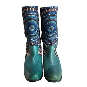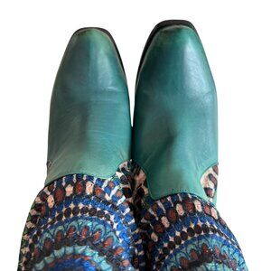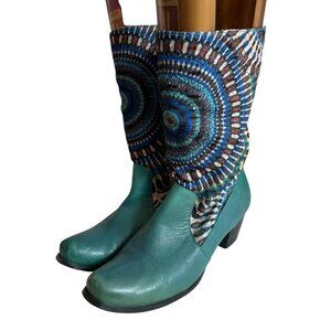 L'artiste by Spring Step western style boots, blue - green leather, semi squared toe, multicolor fabric shaft with radial design,, 10" shaft, 14" opening, block heel, rubber soles, EU 41 / US women's 9.5 - 10, preowned and shows wear on the soles, small flaw on the heel, scuffing - see photos
