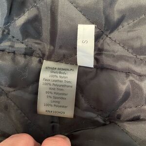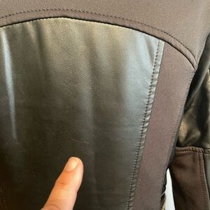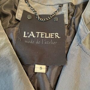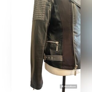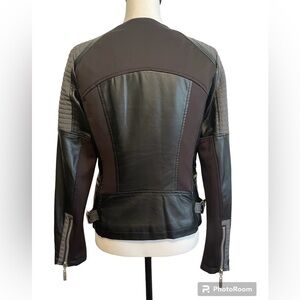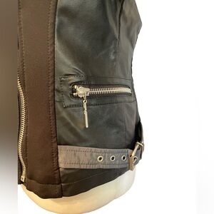 Gorgeous moto jacket from L’Atelier; size small. Black faux leather with gray quilted shoulder/upper arm and gray contrast to collar, buckles and front collar. Front zipper can be worn 2 different ways. Zips at cuffs and in front. 2 zippered front pockets. Panels of stretchy black knit fabric down front and back, across rear shoulders, and down inside of sleeves. Amazing jacket!! Please note in final photo there was a small scratch on the fabric that I touched up with black permanent marker. Other than that, this jacket is in perfect shape! Approximate measurements: