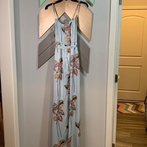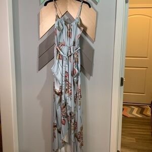 Gently worn. Cannot find size tag but presumed a medium. Gorgeous blue maxi dress with a hi-low hem and pockets. Features elastic at the waist and around the back as well as adjustable spaghetti straps.