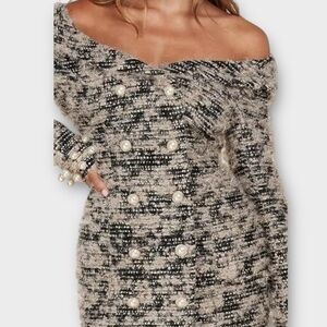 Beautiful Blazer Dress! Black Cream Faux Pearls knit gold tone threads. Faux pearls details knit the cuffs, pearl buttons, double breasted, off the shoulder dress. The fabric does not stretch.