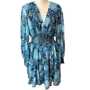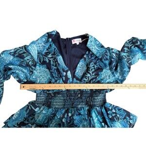 This is a stylish L'Atiste by Amy dress in size 1X, featuring a blue floral chiffon fabric with sheer balloon sleeves and a deep V-neck. The dress has a layered ruffle tiered design, smocked elastic waist, and zippered back closure. It is perfect for formal occasions like weddings, parties, or business events, and is designed for the seasons of Winter, Fall, and Spring.