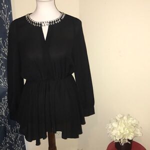 Great, preloved condition. L’Atiste by Amy Peplum Blouse. Black. Semi-Sheer. Rhinestone jewel collar neckline. Small keyhole opening in the front and a larger keyhole opening in the back. Long sleeves. Classic piece great layered for the office and transition into a great date night top. 100% polyester.