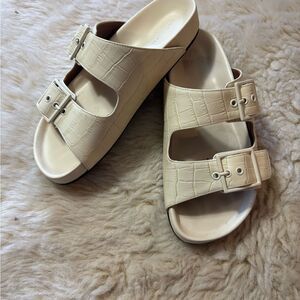 These cream sandals feature a textured upper with two wide straps, each adorned with a striking gold buckle. The molded footbed ensures comfort, making them perfect for everyday wear.
