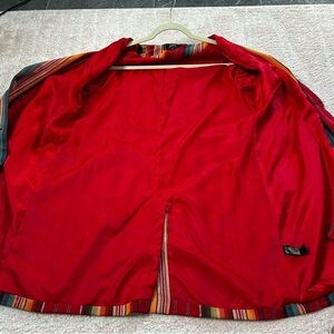 Vibrant and stylish, this colorful striped blazer is perfect for making a statement. The bold design features a mix of red, orange, blue, and green hues, adding a pop of color to any outfit. Ideal for both casual and formal occasions.
