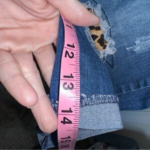 Trendy distressed denim capris with leopard patches sewn in. Perfect for casual outings.
