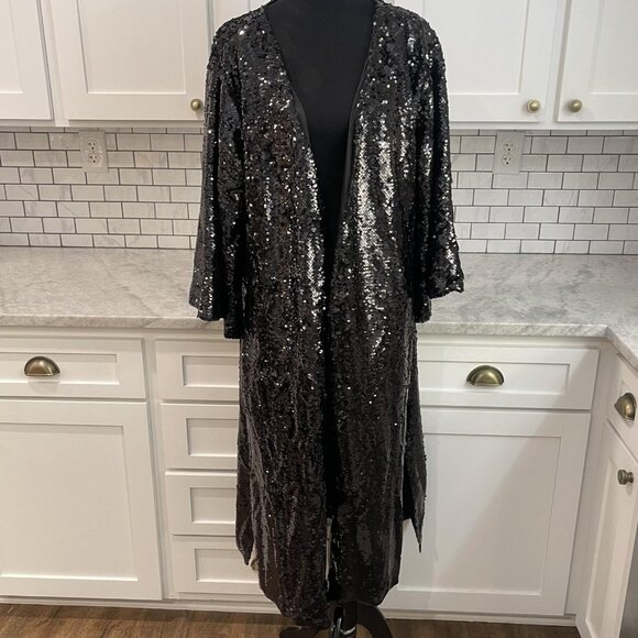 L&B Duster Womens 3XL Black Full Sequin Open Front Jacket Coat Lucky & Blessed