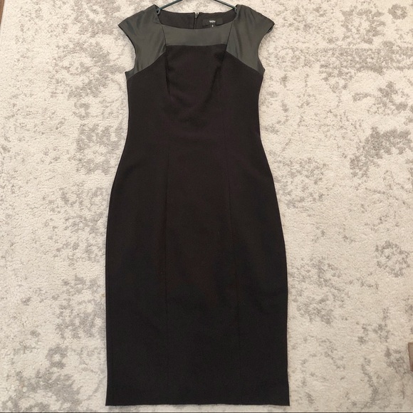 Super chic little black dress. Perfect for work or a night out. Top around shoulders and collar is a faux leather material, giving it a fun look!
