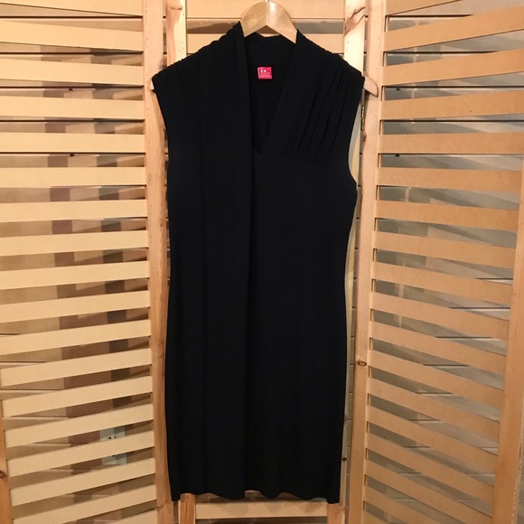 Sleeveless black dress. Simple line but with detailed pleating on the shoulders to add a flow.