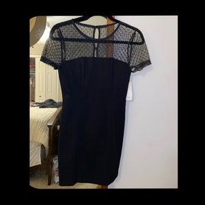 This little black dress is stretchy but fitted! Zips up halfway on the back and then the rest is fastened by three buttons. Great for a night out or for a wedding!