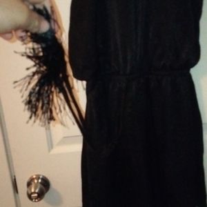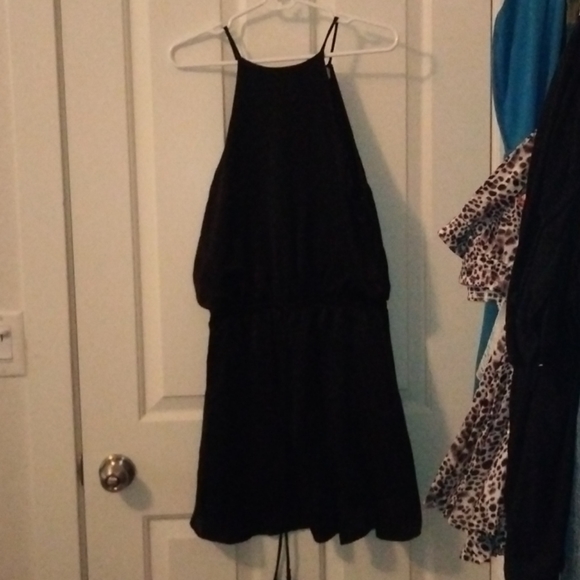 Little black dress with tie at waist line. Ties are adjustable. Halter neck style with silky texture to the fabric. I am 5'1' and the dress goes a little past my knee.