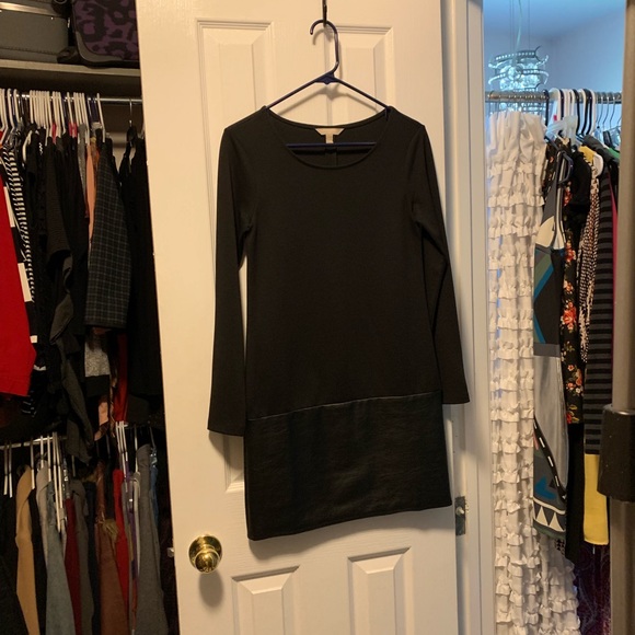 This dress hits around my mid thigh at 5’6” and has a faux leather band on the lower part of the skirt and a fun zipper detail on the 3/4 length sleeves! I love this dress but have never gotten any wear out of it (so it’s in perfect condition)! It’s a size 0 but could easily fit a 2, potentially a 4 if you’re looking for a more snug fit.