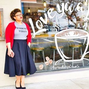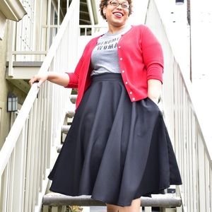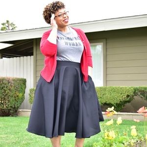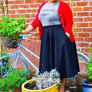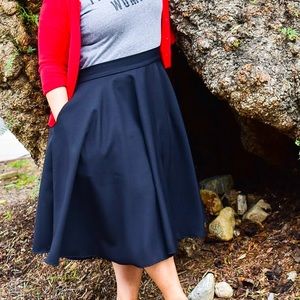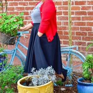 Full circle midi skirt made of polypoplin, looks vintage with crinoline, looks modern with some chucks and a leather jacket . Looks professional with heels or flats and a fancy blouse or cardigan. Has pockets