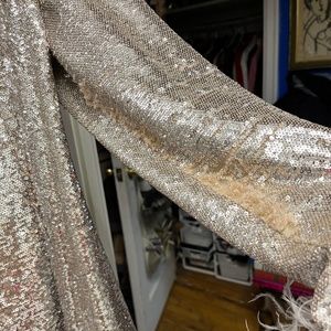 Silver sequin stunner with feathered cuffs.New with tag….BUT noticed that left inner arm has big snag/loss of sequins..see pics. It is not so bad/noticable. (I never noticed before) I discovered when I went to measure sleeve length for my friend.