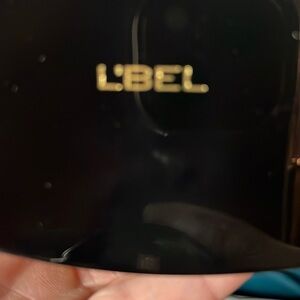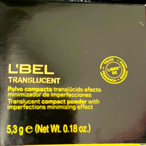 L'Bel translucent compact powder with imperfections minimizing effect. Sleek black and yellow packaging.