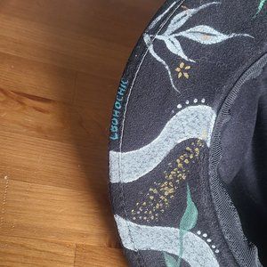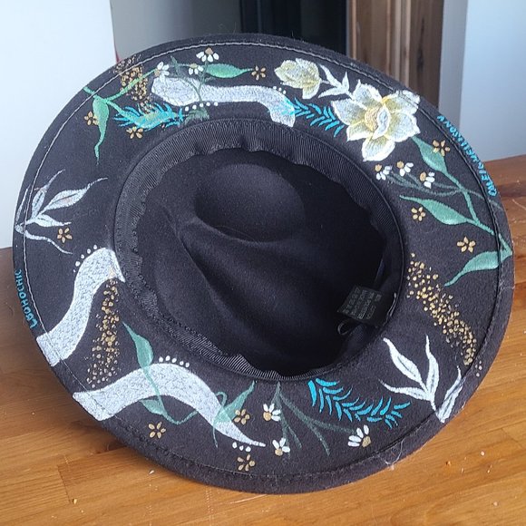 I bought this a few years ago when L'Boho Chic was creating custom-painted hats. It features a really cool flower and snake design in cool blues and greens. Great to add a bit of flare to an outfit. Only worn a few times, as I am not much of a hat person it seems. There is an adjustable ribbon on the inside so it fits a wide range of heads!