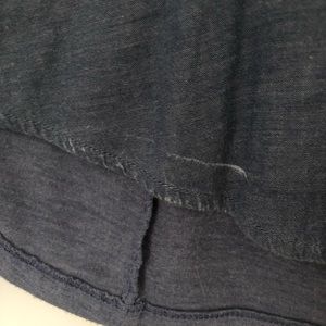 Darling button-up LC shirt with floral embroidery & iridescent buttons. Fabric is cotton but made to resemble a chambray. Sleeves are 3/4 length & has tab collar. Sturdy lace mesh at the back of the shoulders for extra detail. I wish I could fit into this top again. Casual but with a little elevation & boho detailing. Small stain along bottom front hem as seen in last picture, just looks like part of the fabric though.