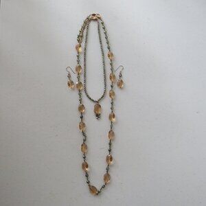 Pre-owned, good vintage condition. Set of 2 vintage necklaces made with the same colors, but in 2 different styles. Plus matching earrings. Colors are light topaz and light green. Beads are plastic, but really nice cut. This set originally comes from Carson Pirie Scott store.
