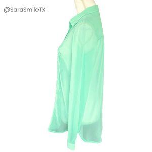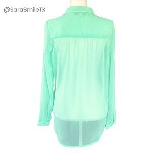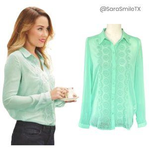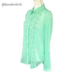 NWOT LC LAUREN CONRAD COLLECTION boho mint green button down top with floral embroidery cutout detail at front. Long sleeves. Semi-sheer. Button cuffs. Collar. New without tags. No flaws. Never worn. Fabric: 100% polyester. Measurements (approx/laying flat): 20“ bust, 19“ waist, 19“ hip, 24” sleeve, 27“ length. Made in India. Size XS - Extra Small. Retail $44.