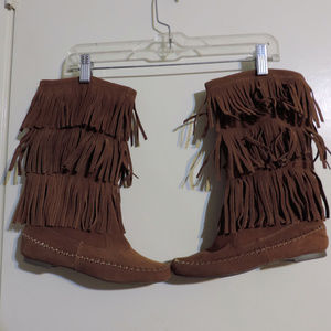 New with stickers! LC Lauren Collection suede leather mid-calf fringe boots. Never worn. Size 5. 3 tiers of suede leather fringe on these boots make them sassy! Nicely accented stitching around the toe. Flexible sole makes for all-day comfort! Nice cloth inners. Originally priced at $99.99 - see photo of the soles for the store sticker info. Please note that the fringe is not laying nicely in the photos due to careful box storage. The fringe will straighten out!