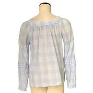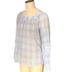 Description: LC Lauren Conrad Plaid Peasant Blouse. Features light gray-blue and white plaid gauzy fabric, semi-sheer, peasant style, long balloon sleeve with ruffles and elastic cuffs, square neckline, flowy blouse, lightweight, falls at hips, bohemian style.
