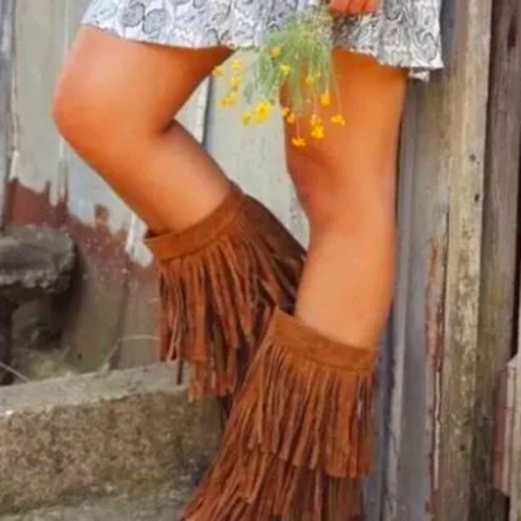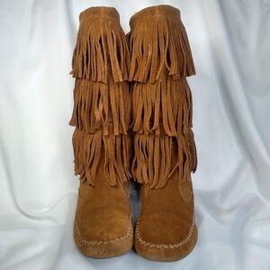 LC Lauren Conrad 3 Tier Fringe Suede Boots Chestnut Boho THIA Size 9 Mid Calf