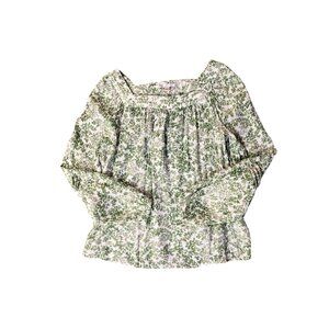 Lauren Conrad blouse, green cream blouse, square neck blouse, long sleeve blouse, rayon blend top, women's casual wear, size L blouse, floral pattern shirt, boho chic blouse, elastic cuff top, lightweight peasant top, gathered sleeve blouse, women's large peasant, Fall, Summer, Spring, Casual