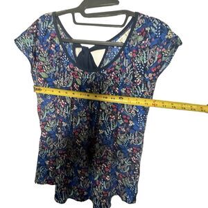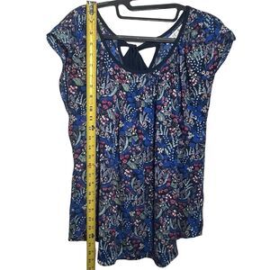 This pre-owned Lauren Conrad cap sleeve blouse in blue floral is a size medium.