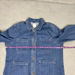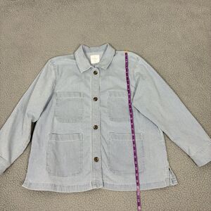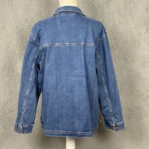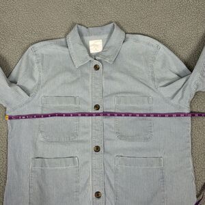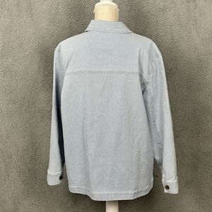 Stylish blue striped jean jacket. Features button closure. Two front pockets. Perfect for casual wear.