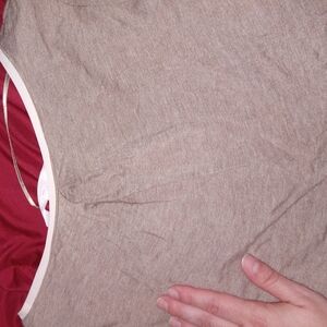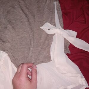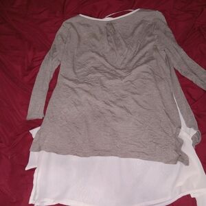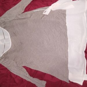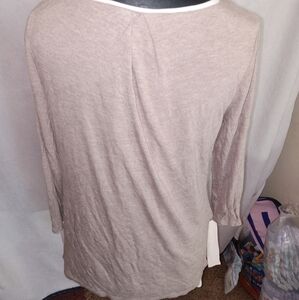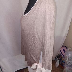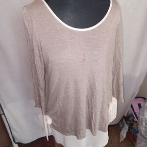Stylish cream blouse with tan layer accents. Perfect for casual outings. Has straps on both sides to tie bows or casual knots, enhancing it's style. 3/4 sleeves and light weight.
