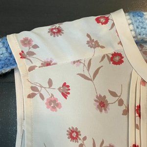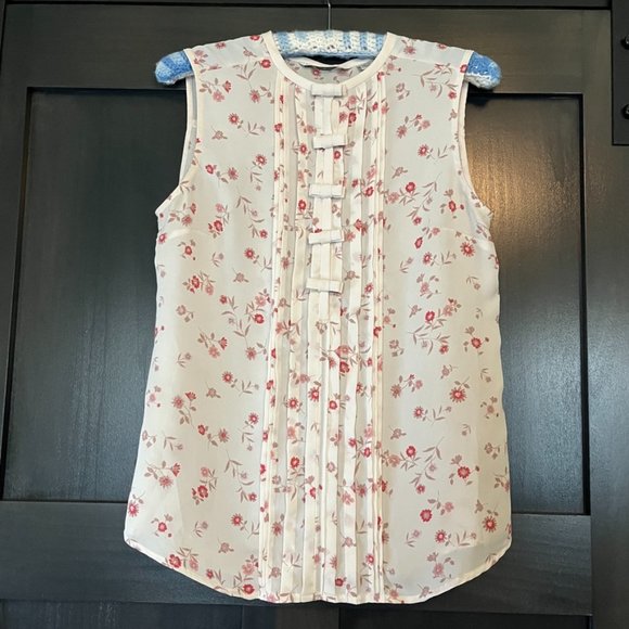 Sleeveless top with delicate floral pattern. Features pleated front. Soft and feminine design.