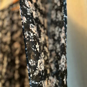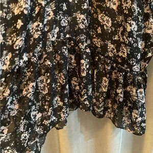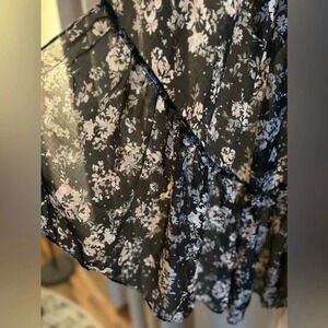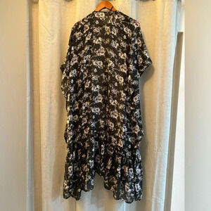 Lauren Conrad Ruffled Feminine Kimono Cardigan. Short sleeve. Arched bottom with flowing ruffle. Women’s One Size. Black, pink white and gray floral design. Great as a cover up or to add to your existing outfit. Middle top to back measures approximately 39” and cascades down further on either side.