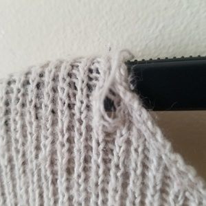 Never worn before, but I did remove the tags. This sweater is a very soft and flowy sweater. There is a cute bow on the back of it. I believe a hanger snagged the back left shoulder. It is not very noticeable(you can't even see it in the second picture), but I did want to make sure I put that in the description.