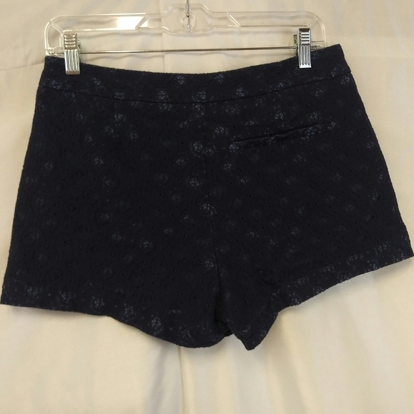 LC Lauren Conrad Women's Dark Blue Mid Rise Floral Pattern Crochet Lace Shorts. Shell: 80% Cotton, 20% Nylon. Blue Lining: 100% Polyester. Button/Zipper Front Closure. Front Pockets. One Faux Back Pocket. Pleated Waist. Measurements approx. Flat Lay. Waist: 14.5, Rise: 10, Hips: 17.5, Inseam: 3 Hem Opening: 10 Size 8. Color May Vary Due To Lighting.