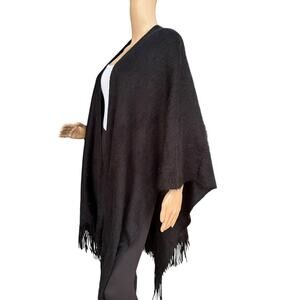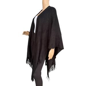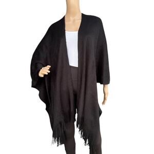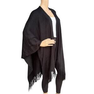 LC Lauren Conrad OS Black Fuzzy Knit Poncho Wrap Shrug Fringed Shawl