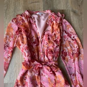 Romantic and feminine, this LC Lauren Conrad mini dress is perfect for spring and summer! Features a pink/orange floral print with metallic accents, ruffle trim, sheer long sleeves, and a belted waist for a flattering fit. Lightweight and fully lined – ideal for brunch, garden parties, or date nights.