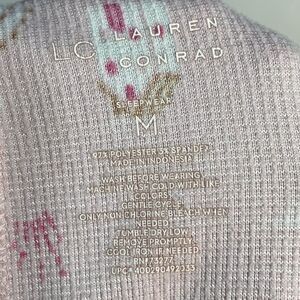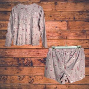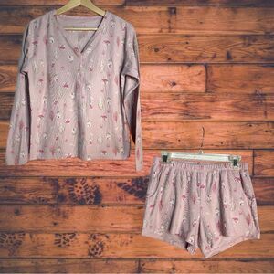 Comfortable pink pajama set with floral pattern. Includes long-sleeve top and shorts. Perfect for lounging.